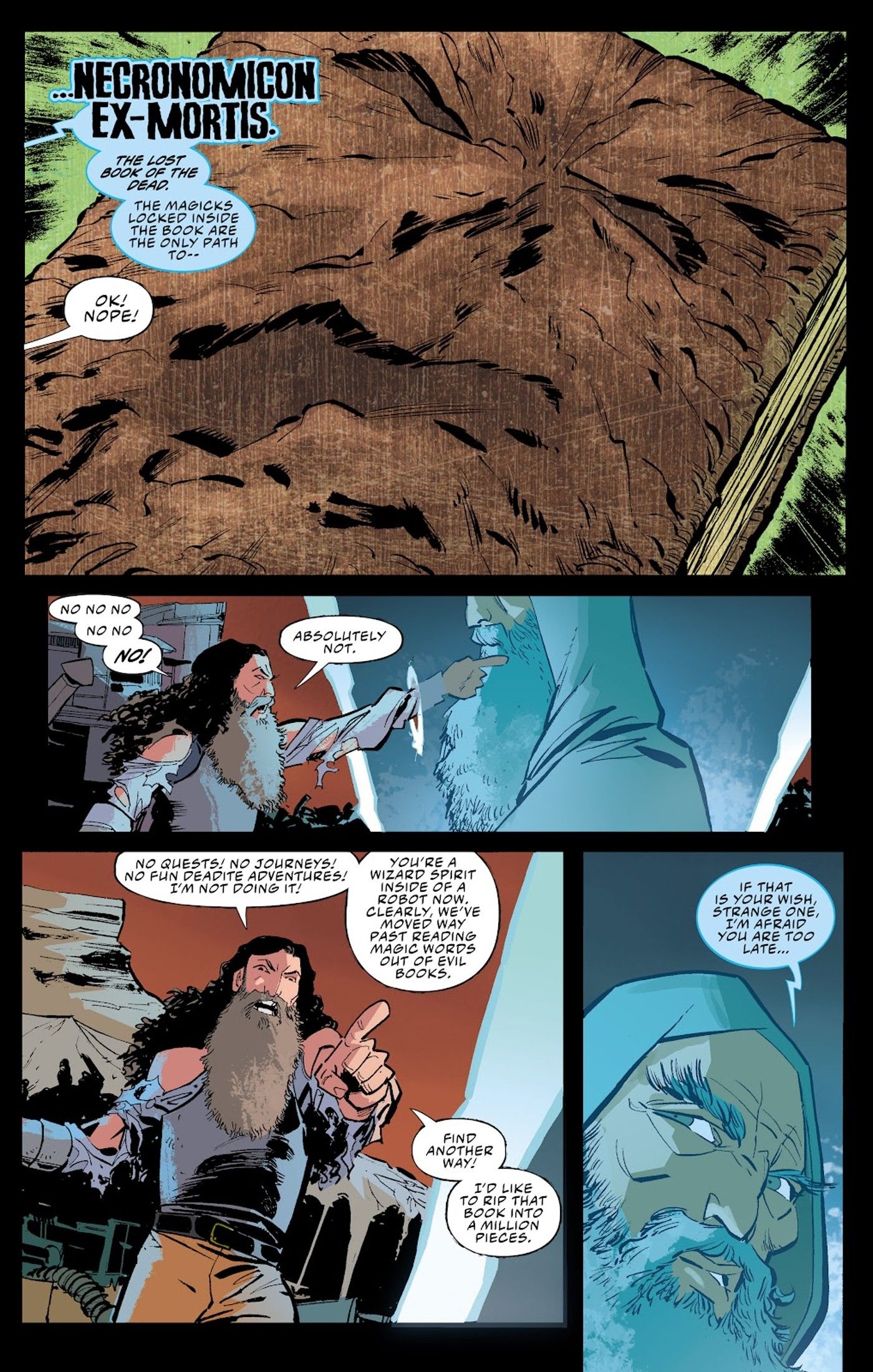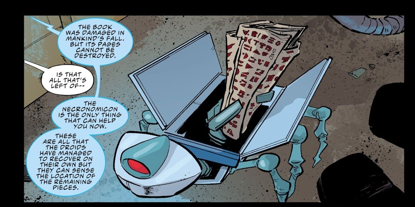 Ejército de las tinieblas para siempre #3, de Tony Fleecs, Justin Greenwood, Brad Simpson, Troy Peteri, Joe Rybandt y Marshall Hoyt, revela que en el oscuro futuro de la serie, el Necronomicon en sí está prácticamente muerto.