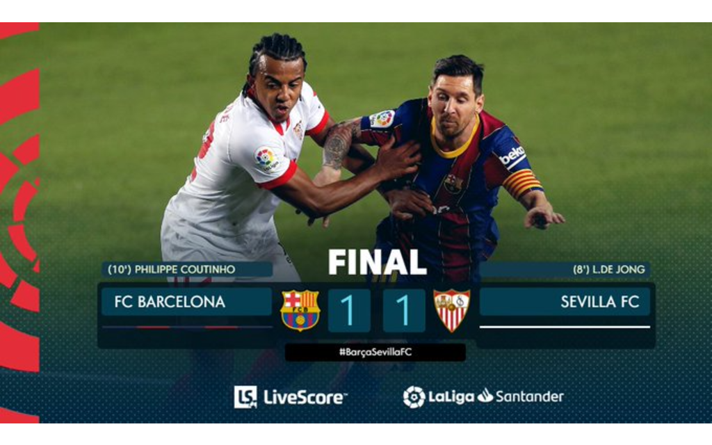 El conjunto blaugrana iguala 1-1 con los andaluces, tras los goles del holandés Luuk de Jong (8′) y del brasileño Philippe Coutinho (10′).