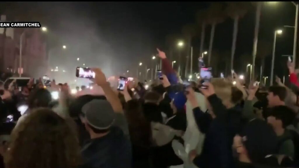 Oficiales de policía con cascos antidisturbios y armados con porras rodearon a la multitud y comenzaron a disolver la reunión después de que se usaron los fuegos artificiales. Los videos de las redes sociales mostraron objetos arrojados a los oficiales, personas saltando encima de los autos y celebrando en la calle en el centro de Huntington Beach.