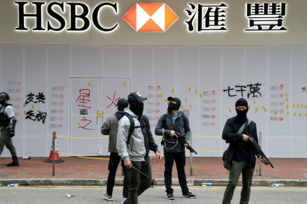 La tensión aumentó después de que se realizaron algunos arrestos en el distrito de bares Wan Chai, cuando varios activistas vandalizaron una sucursal del gigante bancario HSBC, lo que provocó que los agentes les rociaran gas pimienta.