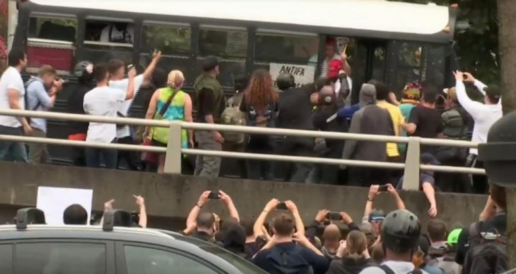 A partir del mediodía, la mayoría de los grupos de derecha habían abandonado la zona a través de un puente en el centro. La policía utilizó a agentes en bicicletas y con equipo antimotines a fin de evitar que miembros de tales grupos fueran seguidos por manifestantes antifascistas vestidos de negro, con casco y el rostro cubierto _ conocidos como antifa.