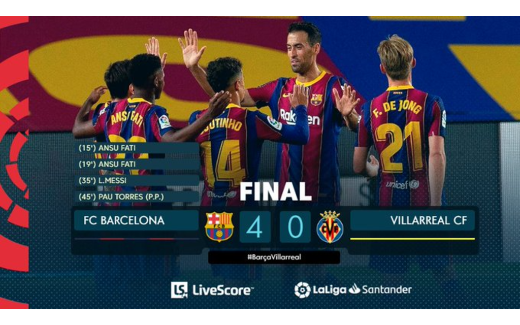 Barcelona se presentó en la Liga de España con una balsámica goleada 4-0 ante Villarreal en el Camp Nou, liderada por el joven Ansu Fati, autor de un doblete y origen de un penalti convertido por Lionel Messi en un partido que estaba sentenciado al descanso.
