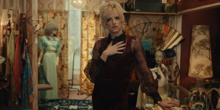 “Curiosamente, en uno de los primeros guiones, era un drag queen. Pero luego, esa idea cambió porque todos se dieron cuenta de que era más importante, como dije, que es una elección de estilo de vida para él, no una actuación. es fabuloso en todos los sentidos. Creo que es importante decir que es queer porque, obviamente, mucha gente vestía así en ese momento y no era necesariamente queer, pero en mi cabeza, él siempre lo fue “.