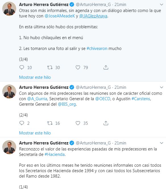 El titular de Hacienda, Arturo Herrera, reconoció que sostuvo un encuentro con el excandidato presidencial José Antonio Meade; y con el exsecretario de Desarrollo Social, José Antonio González Anaya, en Palacio Nacional.