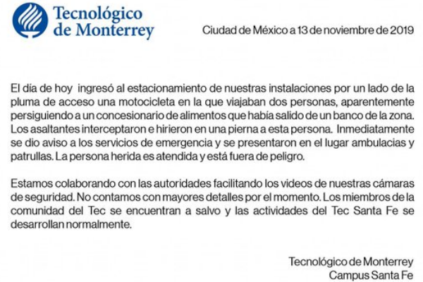 En un comunicado, la Secretaría de Seguridad Ciudadana (SSC) informó que “el incidente ocurrido en las instalaciones del Tecnológico de Monterrey Campus Santa Fe, alcaldía Álvaro Obregón, ocurrió en la zona del estacionamiento, no se trató de un atentado en contra de los estudiantes, ni de ninguna autoridad escolar”.