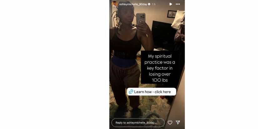 ashley Recientemente usó Instagram para revelar la forma real en la que perdió montones de kilos, suficientes para participar en competencias de culturismo. Posó frente a un espejo para tomarse una selfie. Ashley parecía estar parada en su sala de estar con pantalones cargo, una camiseta sin mangas con un cinturón con tachuelas y botas. Hizo un puchero por la foto e hizo una gran confesión. ella escribió eso su “práctica espiritual“fue un factor clave para ayudarla a perder más de 100 libras.