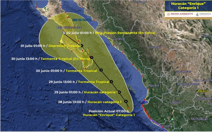 El Huracán Enrique, categoría 1, avanza por las costas de Jalisco y podría degradarse a tormenta tropical el día de mañana 29 de junio.