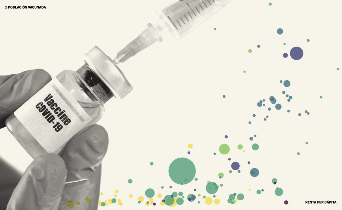 La desigualdad en el acceso a las vacunas ha sido una preocupación constante en la mayor campaña de vacunación de la historia y, casi seis meses después de su comienzo, el mundo está efectivamente dividido por la riqueza. Los países que superan el 30% de gente vacunada son países ricos, o relativamente ricos, mientras que casi ningún país pobre ha conseguido inmunizar siquiera al 10% de sus ciudadanos. El PIB distingue a los países que inoculan a buen ritmo, muchos de los cuales están doblando sus curvas de covid-19.