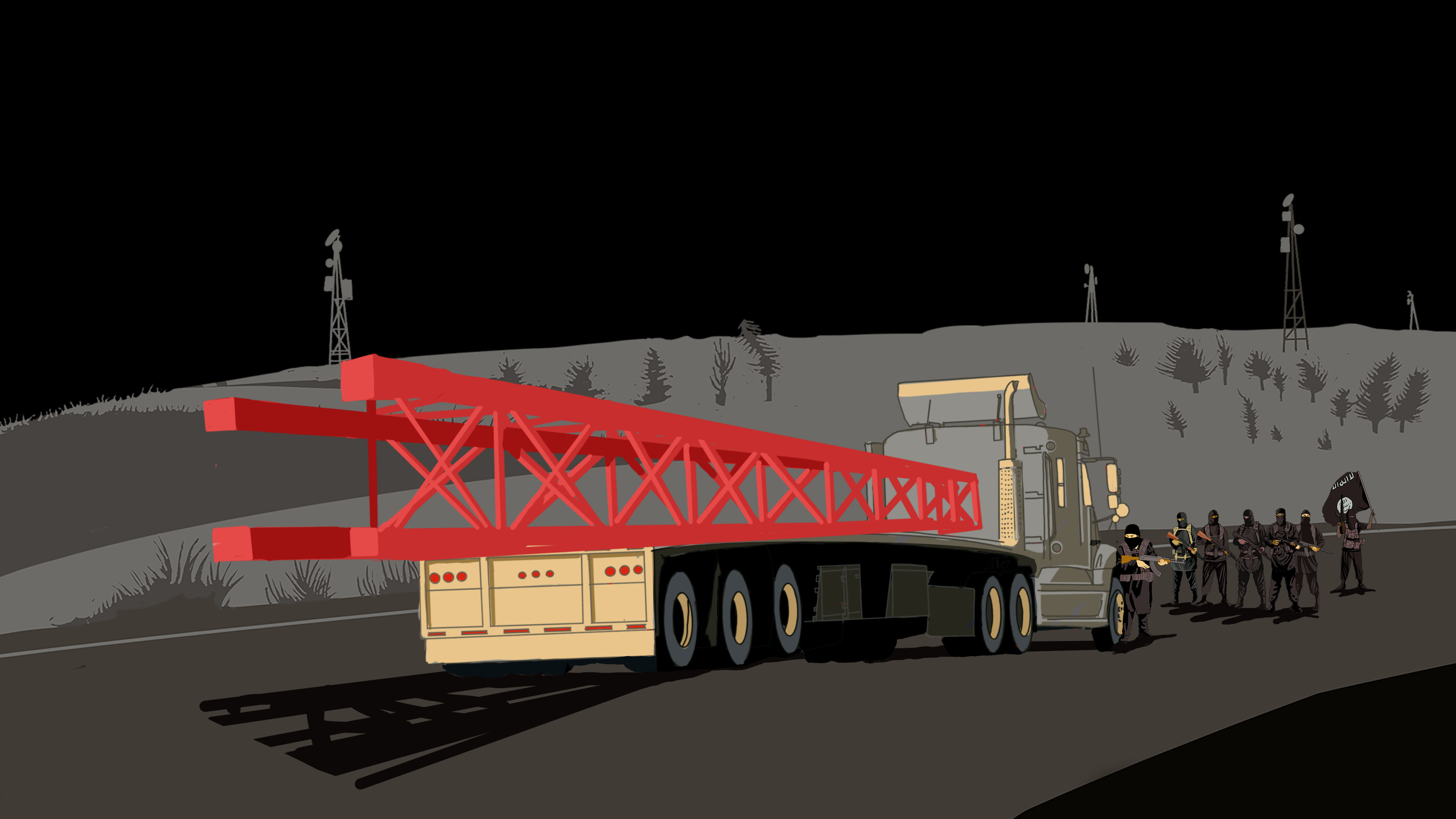 La conocida como “vía rápida” era más larga en kilómetros ―y más cara— pero tenía la ventaja de evitar los puntos de control de la aduana iraquí, donde ese tipo de material podía quedar retenido días o incluso semanas. El único problema de esta ruta alternativa era que había que atravesar territorio controlado por el Estado Islámico. Es una ruta conocida por los periodistas y los camioneros del país entrevistados para esta investigación periodística: los militantes del califato creaban puntos de control y atacaban o secuestraban a los viajeros en cualquier lugar de sus 100 kilómetros de recorrido. Un camionero de unos 40 años la define como “aislada, terrorífica e insegura”, en declaraciones a la empresa de radio y televisión alemana NDR. Solía transportar ahí comida y bebida, y llegó a ver, al lado de la carretera, un camión en llamas con un hombre muerto de un disparo tendido al lado.