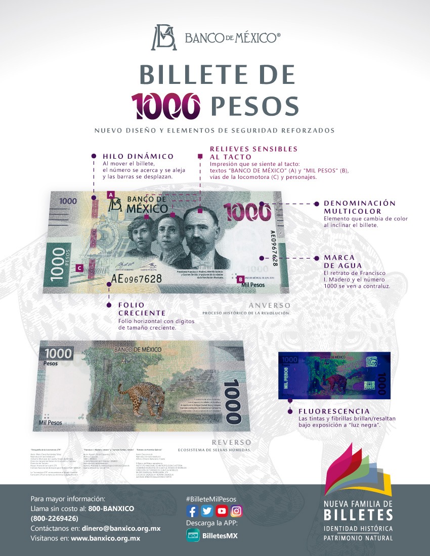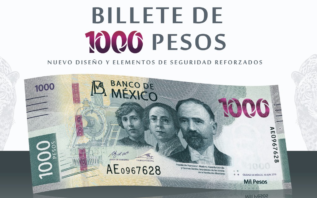 En el nuevo billete de mil pesos, presentado este jueves por el Banco de México, se representa el proceso histórico de la Revolución en México con el presidente Francisco I. Madero, Hermila Galindo y Carmen Serdán, impulsores de los ideales revolucionarios de democracia, igualdad y justicia.