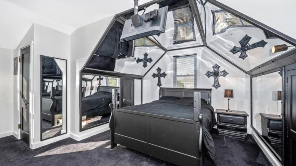 Lo cierto es que para los amantes de lo oscuro y siniestro, esta vivienda será toda una fantasía. En la decoración no falta un detalle como cruces, ataúdes en todas las habitaciones, elementos vampíricos, homenajes siniestros a los Oakland Raiders y hasta una cripta para coches.