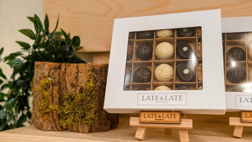 Puedes comprar el chocolate de Late & Late en distintas cajas. Tienes la «Minibox» una caja con una selección de bombones de praliné y también bombón de chocolate y vino que no deja a nadie indiferente. Es una caja que consta de 3 bombones aunque tenemos versiones más grandes de 20, 40 y hasta 80 unidades.