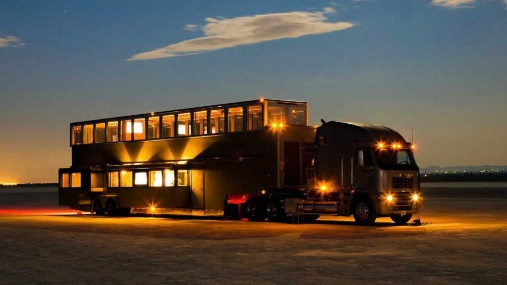 En su planta baja encontramos una cocina completa con un salón comedor y una sala para pasar el día que también se puede transformar en vestidor. Ya en la parte de arriba, encontramos varias habitaciones, un cuarto de baño que ocupa todo el ancho del transporte y que está valorado en 21.00 euros, y lo más impresionante, una sala de cine con capacidad para 30 personas.