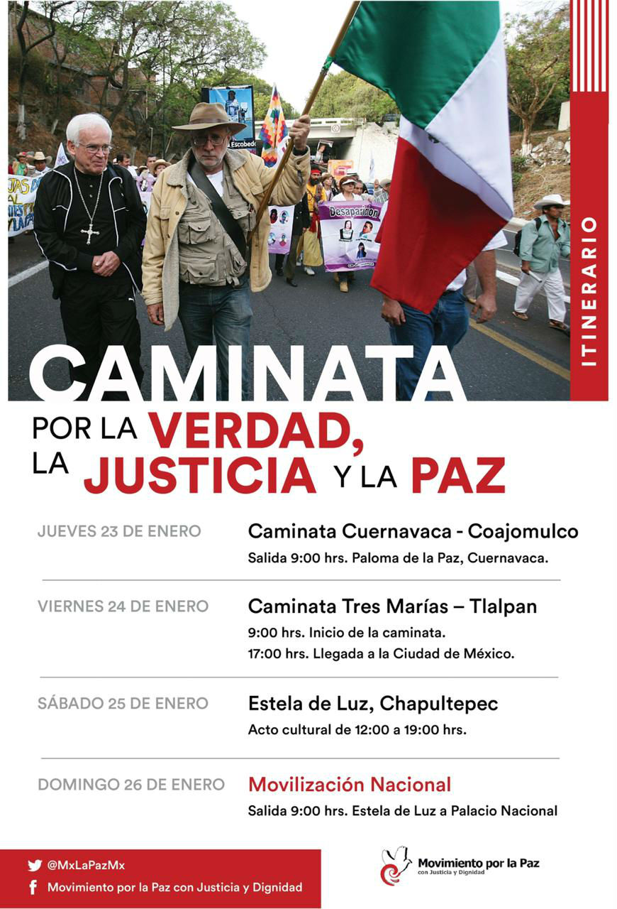 Con un contingente de aproximadamente mil personas, la mañana de este jueves inició en Cuernavaca la Caminata por la Verdad, la Justicia y la Paz, en la que avanza a la cabeza el poeta Javier Sicilia, líder del Movimiento por La Paz con Justicia y Dignidad (MPJYD), quien advirtió que “sin verdad ni justicia… lo único que habrá es más infierno… hoy la amnistía significa impunidad y olvido”.