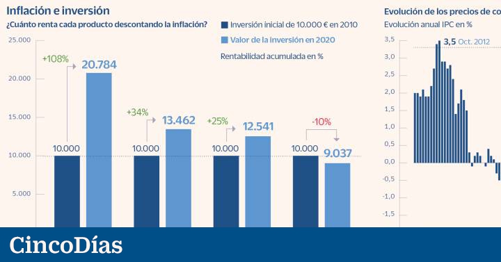 La carcoma de la inflación se aprecia mejor en términos de coste de oportunidad. Un inversor europeo que hubiera destinado esos 10.000 euros a un fondo de inversión de Bolsa habría conseguido al finalizar el periodo 20.784 euros, descontando ya el efecto de la inflación.