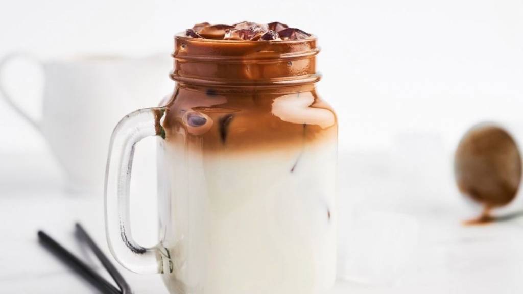Una vez lista la crema, echamos la leche en un vaso, hasta completar 2/3 partes. El resto lo llenamos con la crema de café que hemos preparado. Si quieres que el café Dalgona quede más frío, puedes añadir hielo a la leche antes de echar la crema.