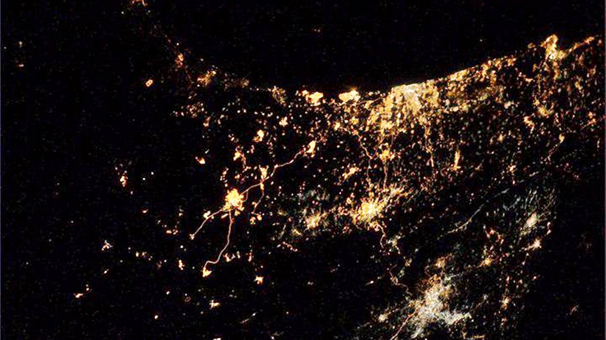En la parte superior de la imagen se puede ver el Mar Mediterráneo y el punto más brillante, en la costa, es Tel Aviv –capital del Estado de Israel- y a la izquierda de ésta ciudad, a 70 kilómetros sur se encuentra Gaza.