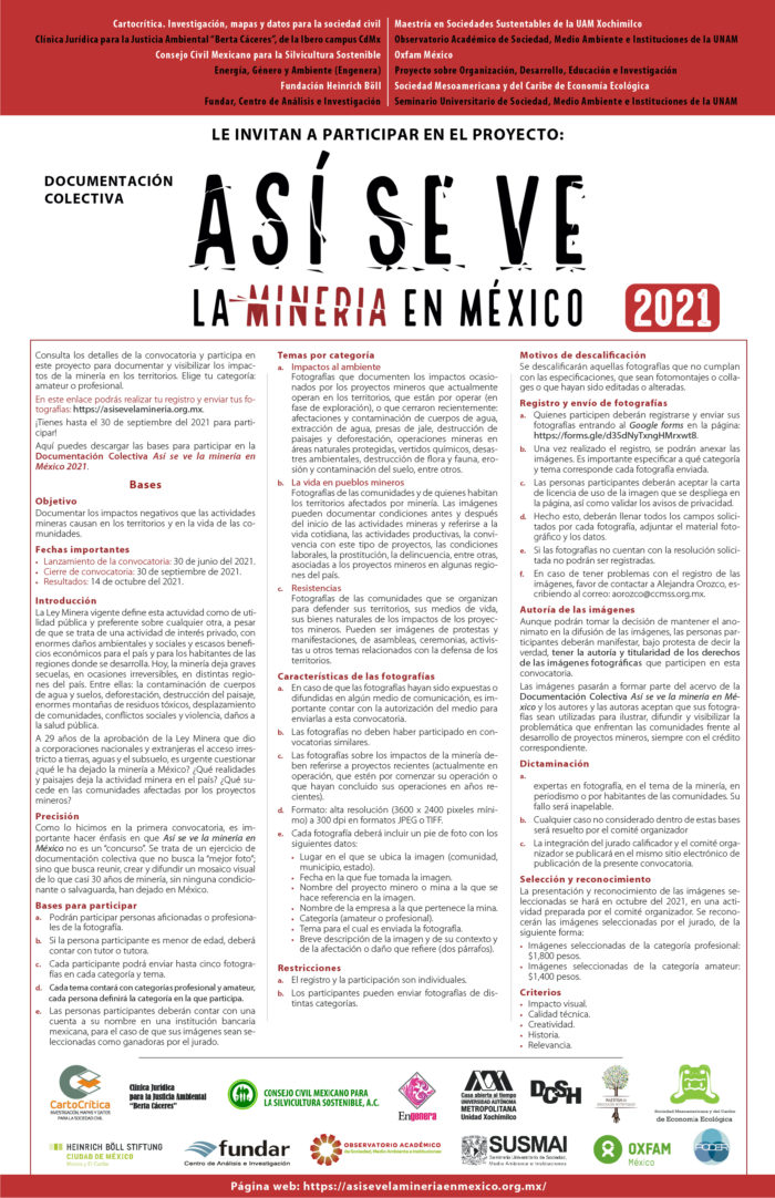 “Así se ve la minería en México es un ejercicio colectivo de documentación que busca reunir fotografías y crear un mosaico visual sobre los impactos ambientales y sociales de la minería en nuestro país. La convocatoria estará abierta hasta el 30 de septiembre y se podrá participar en tres grandes temas: a) impactos ambientales, b) resistencias, c) la vida en los pueblos mineros, y dos categorías: profesional o amateur. Consulta las bases en: asisevelamineriaenmexico.org.mx“, finalizaron.