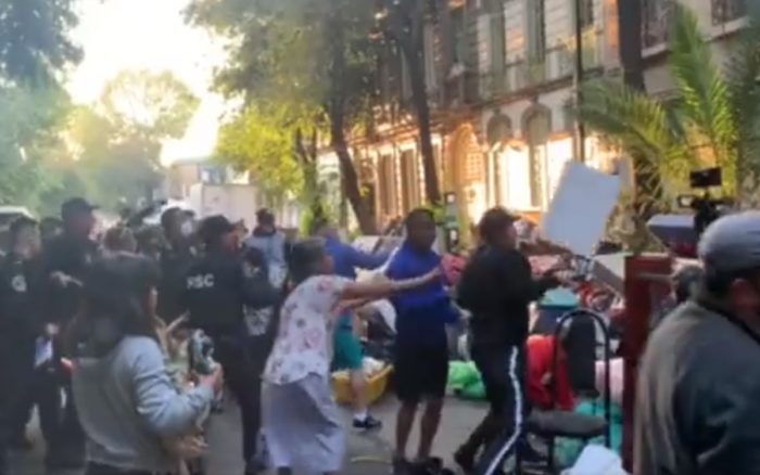 En videos que circulan en redes sociales se observan enfrentamientos entre los supuestos agresores y los inquilinos, mientras que las pertenencias de estos últimos posaban en la cera de la calle.