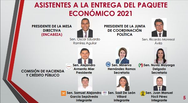 Por parte del Senado de la República, asistirán el presidente de la Mesa Directiva, Oscar Eduardo Ramírez Aguilar, el presidente de la Junta de Coordinación Política, Ricardo Monreal Ávila, y los integrantes de la Comisión de Hacienda y Crédito Público.