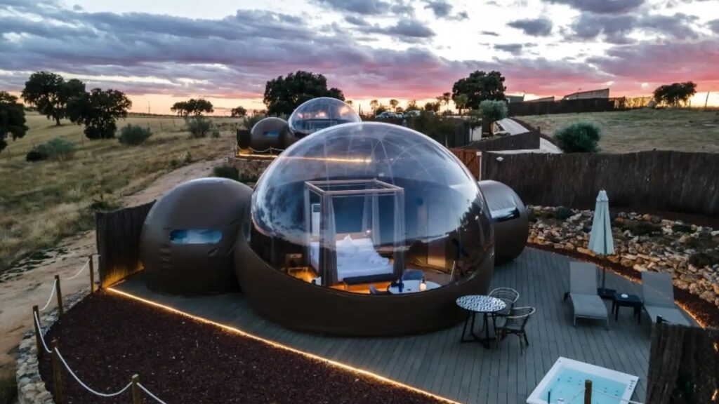 Ubicado en Hormigos, en la provincia de Toledo, este hotel burbuja está en plena naturaleza, a tan sólo 90 km de Madrid, un establecimiento sostenible en el que incluso podrás recargar tu coche eléctrico. Los precios van desde los 249€ hasta los 379€ según el pack contratado.