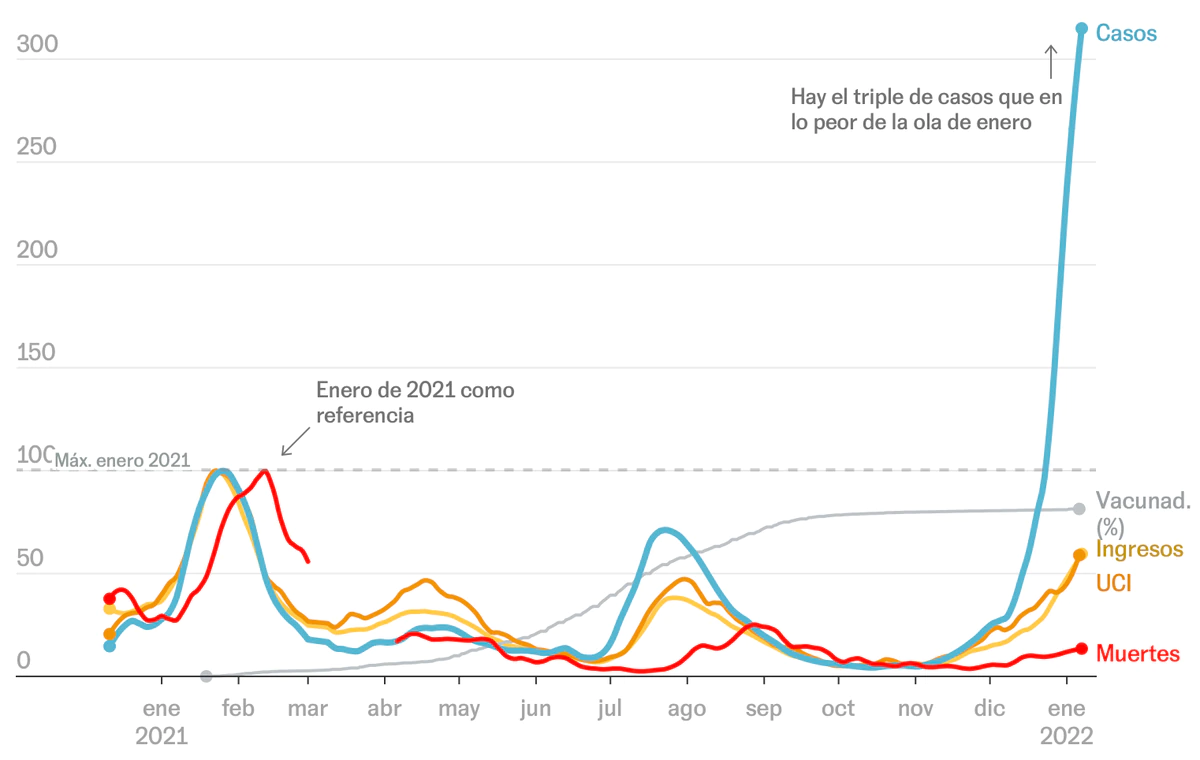 El gráfico siguiente muestra las cifras de casos, ingresos y fallecimientos en relación a la ola de enero de 2021.