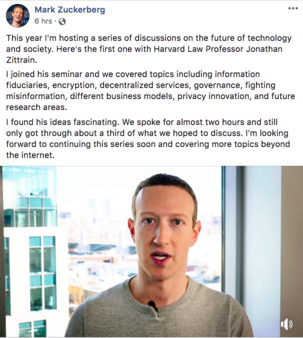 Mark Zuckerberg: Por lo tanto, leí su artículo de opinión y también leí la publicación de blog de Balkin sobre fiduciarios de información. Y también he tenido una conversación con él.