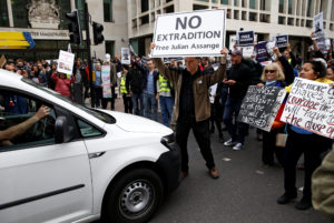Manifestantes frente a la Corte de Magistrados de Westminster, donde el fundador de Wikileaks, Julian Assange, tuvo una audiencia de solicitud de extradición a Estados Unidos, en Londres (Foto: REUTERS/Henry Nicholls)
