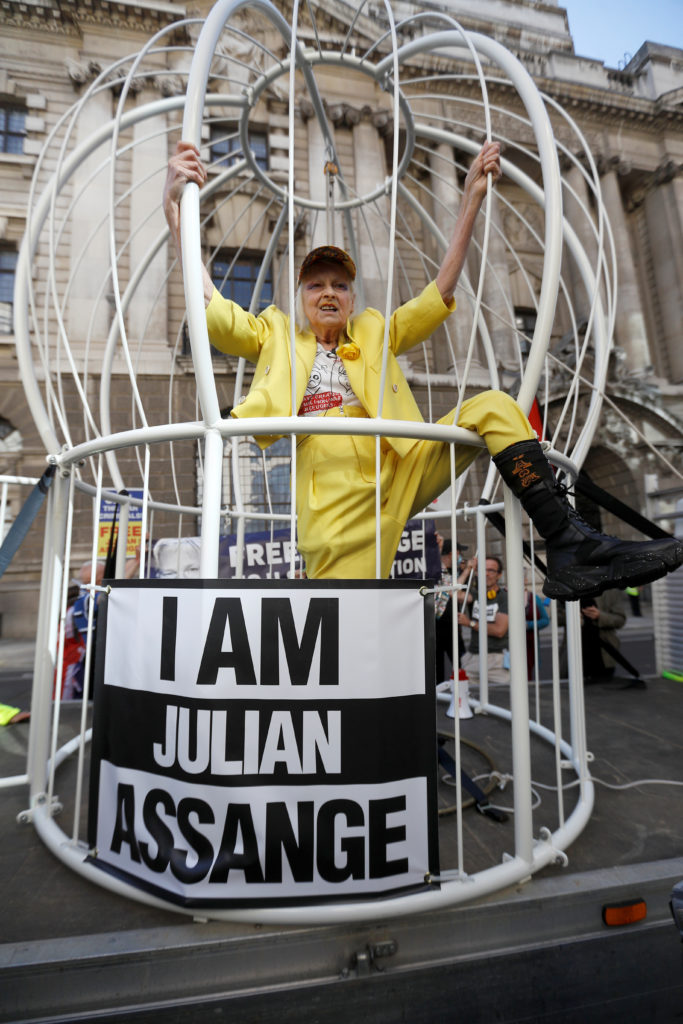 La diseñadora británica Vivienne Westwood muestra su apoyo a Julian Assange.