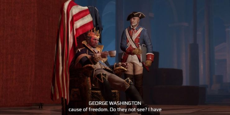 Los eventos del juego también son canónicos. Tienen lugar en una línea de tiempo alternativa y evitada vista a través de una visión compartida por el protagonista Connor y el propio Washington. Este evento luego afecta radicalmente el cambio a lo largo de las próximas décadas, en el universo. No solo es un concepto divertido, sino que también es importante para la serie, como un todo.