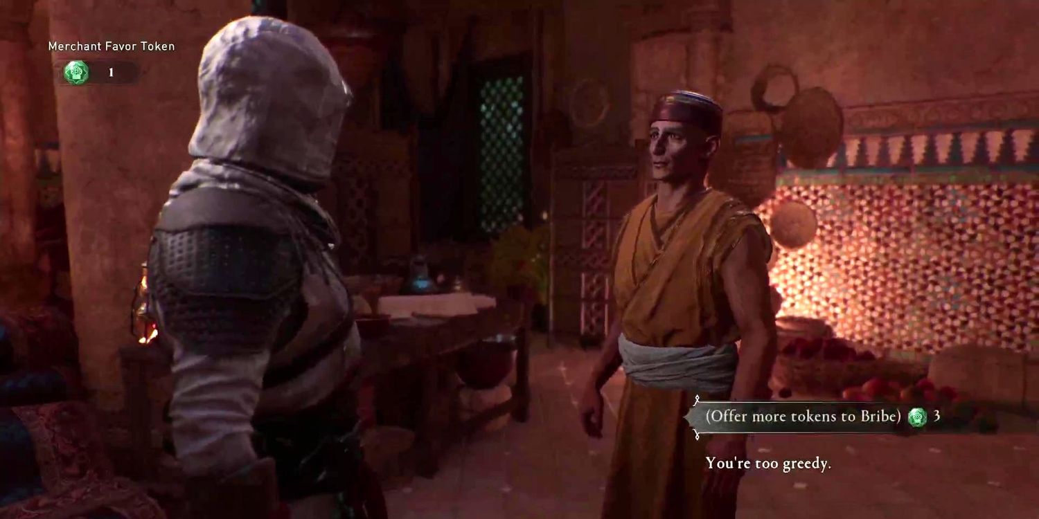 Si usted tiene Assassin’s Creed: Espejismo‘s Fichas de comerciante almacenado, será mucho más fácil entrar por las puertas. Hay un Eunuco en un patio lateral que brillará en naranja si Basim usa su Sentido del águilay hablar con él y sobornarlo con un total de 4 Las fichas de comerciante Khidmah lo convencerán de dale a Basim la llave maestra. Pero, si no quieres gastar esa moneda, hay otra manera.