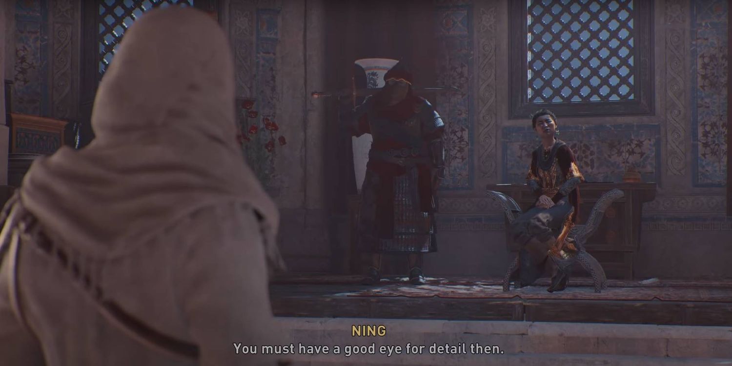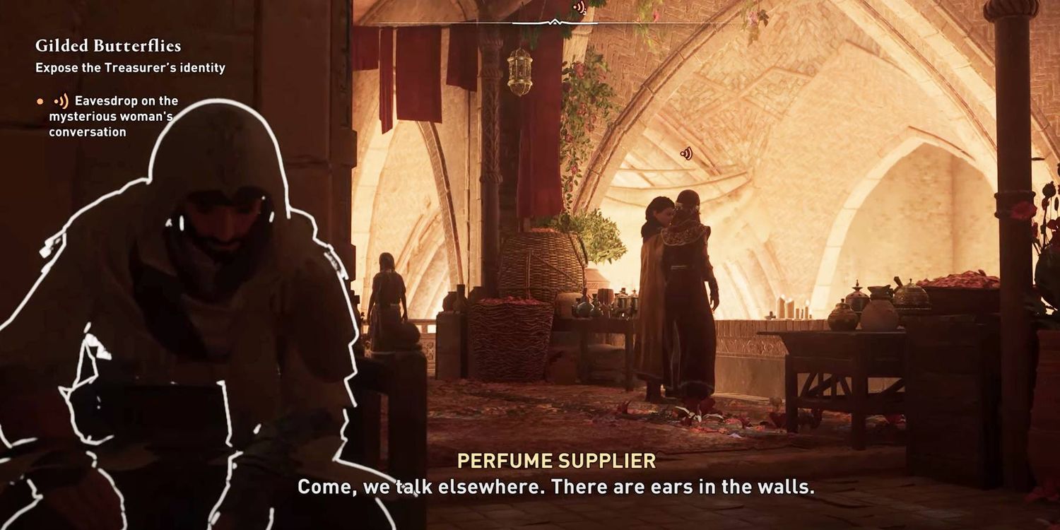 Una de las dos mujeres aquí es una Proveedor de perfumes hablando con alguien llamado Atrapalo antes saliendo a un lugar más privado. Usa las habilidades de sigilo entrenadas por Basim para siguelos y conozca más sobre los negocios y proyectos del Tesorero en Espejismo del Credo del Asesino. Después escuchando a escondidas un poco más, hablar con qabiha saber que el Tesorero tiene un interés particular por un perfume especial elaborado con sangrey que en realidad son un mujer llamada ning.