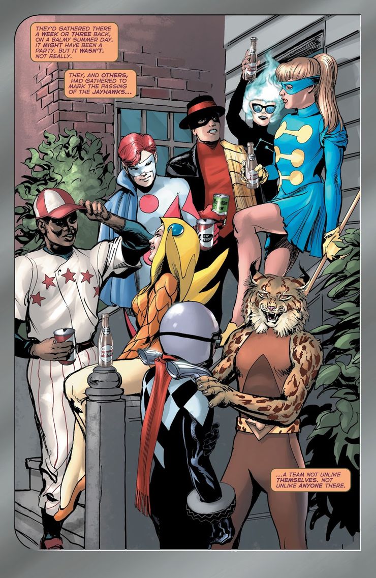 Ciudad Astro es una serie de antología que explora no solo la vida de los superhéroes en la ciudad titular, sino también cómo sus hazañas impactan a las personas comunes en el terreno. Es famoso por jugar y subvertir los tropos comunes de las historias de superhéroes. Esta nueva historia da un paso atrás en el pasado, siguiendo a un grupo de compinches que han decidido emprender un viaje por carretera a través de los Estados Unidos para tratar de descubrir cómo progresar más allá de su infancia. El viaje sigue la muerte de un equipo de otros jóvenes héroes conocidos como los Jayhawks, lo que lleva a los sobrevivientes a reevaluar cómo viven sus vidas. Las preocupaciones sobre la universidad, el compromiso con los superhéroes y simplemente envejecer acosan sus pensamientos mientras se sientan alrededor de la fogata.