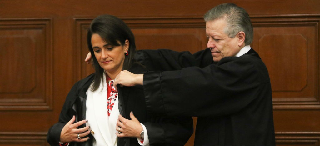 Este lunes, el presidente de la Suprema Corte de Justicia de la Nación (SCJN), Arturo Zaldívar, invistió como ministra a Margarita Ríos-Farjat, hecho que calificó como histórico, ya que por primera vez, desde la reforma que entró en vigor en 1994, habrá tres mujeres ministras en el máximo tribunal.