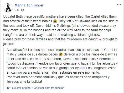 A las 19:00 horas (tiempo del centro de México), un usuario de Facebook identificado como Lafe Langford Jr. denunció que Christina y Dawna Langford fueron asesinadas y sus hijos, heridos; previamente, el mismo hombre había publicado que Rhonita Miller, familiar de las hermanas Langford, y sus cuatro hijos habían sido asesinados y la camioneta en que viajaban había sido quemada.