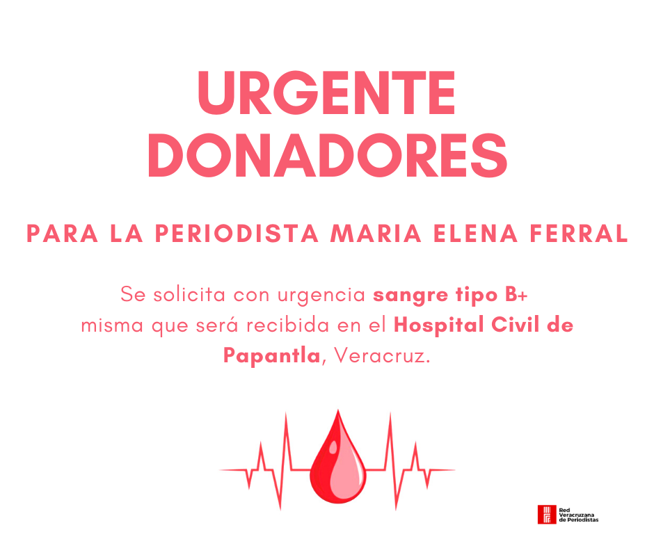 #URGENTE La familia de la periodista María Elena Ferral solicita donadores de sangre B+ en calidad de urgente. Las donaciones se efectúan en el Hospital Civil de Papantla.