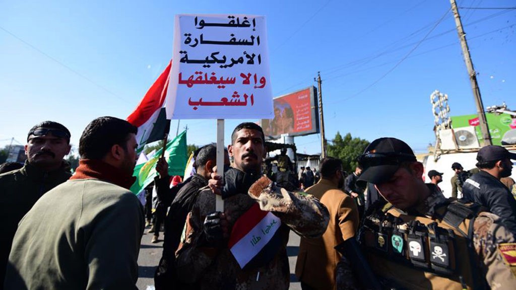 Partidarios e integrantes de esas agrupaciones armadas acudieron este martes a la Embajada estadounidense después de participar en los funerales de las víctimas del bombardeo del domingo y empezaron a trepar por los muros de la sede diplomática, y finalmente consiguieron irrumpir en una parte del complejo.