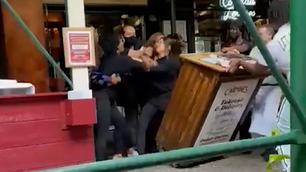 El video exclusivo de un teléfono celular obtenido por nuestra cadena hermana NBC New York muestra el ataque del jueves por la noche afuera del restaurante Carmine’s en el Upper West Side, alrededor de las 5 p.m., los ánimos se enfurecieron y el puesto de la trabajadora casi se vuelca en medio del caos, con un camarero en un momento ayudando a sacar a alguien de la escena.