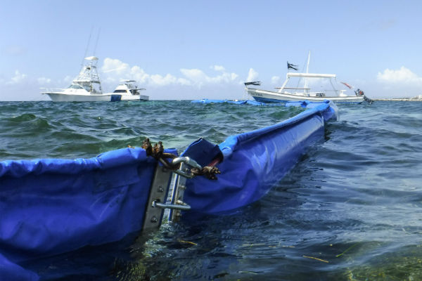 El gobierno municipal de Puerto Morelos, Quintana Roo colocó barreras marinas en las playas caribeñas para contrarrestar sargazo. 13 de mayo 2019.