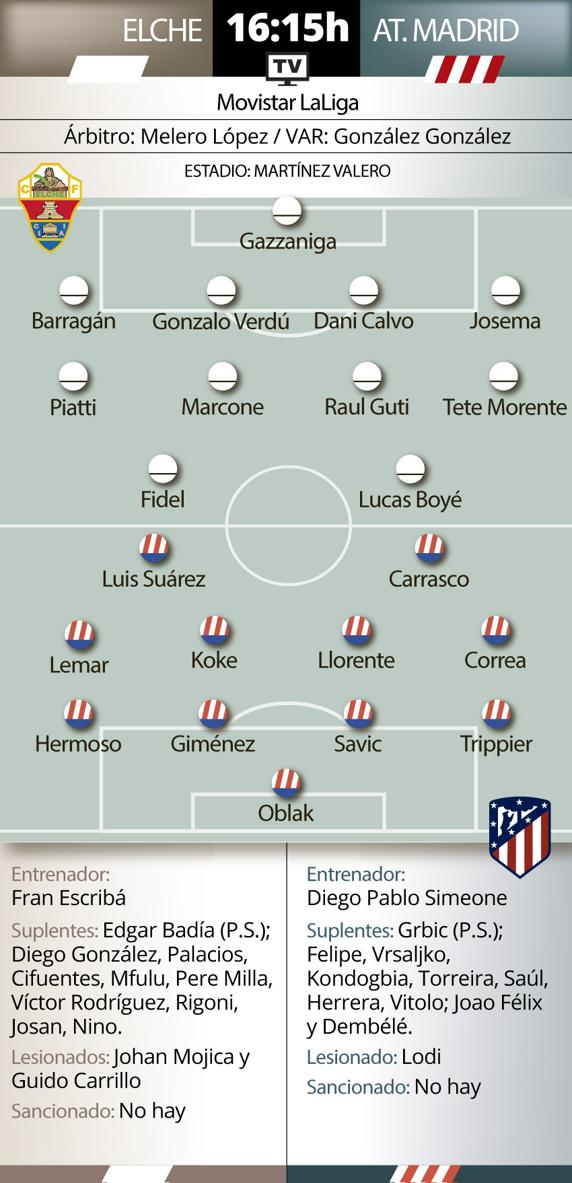 El Cholo sólo tiene la baja de Lodi, de última hora, y el once más o menos claro con algún asterisco en la persona de Koke, que no llega en su mejor momento físico tras entrenarse al margen en varias sesiones de esta semana. Por lo demás, el Cholo medita meter a Lemar y Suárez en el once, primera vez desde su vuelta tras lesión, que se sumarían a los Llorente, Correa y compañía. Mucha pólvora y una declaración de intenciones que veremos si materializa desde el juego en el césped del estadio Martínez Valero.