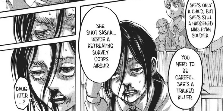 Las verdaderas profundidades del giro nihilista y asesino de Eren tardan en desarrollarse, y gran parte del preludio del final implica una red bizantina de traiciones personales, sobre todo en la saga de Marleyans Gabi Braun y Falco Grice para escapar de Eldia después de viajar de polizón en un dirigible. Muchos fanáticos han criticado la relativa falta de acción en estas secuencias, sin embargo, cabe señalar que se presta especial atención al trauma duradero que sufren muchos de los personajes a raíz de las vidas trágicas que han vivido. Seguramente un mundo de tales monstruos debe dejar una marca, y las parábolas morales de Isayama solo se vuelven más personales a la luz de este hecho. Se debe dar una mención especial a la relación de Gabi y Kaya, una joven que fue salvada de un Titán enloquecido por Sasha Blusa, miembro de Survey Corps (quien es famosamente asesinada por Gabi).