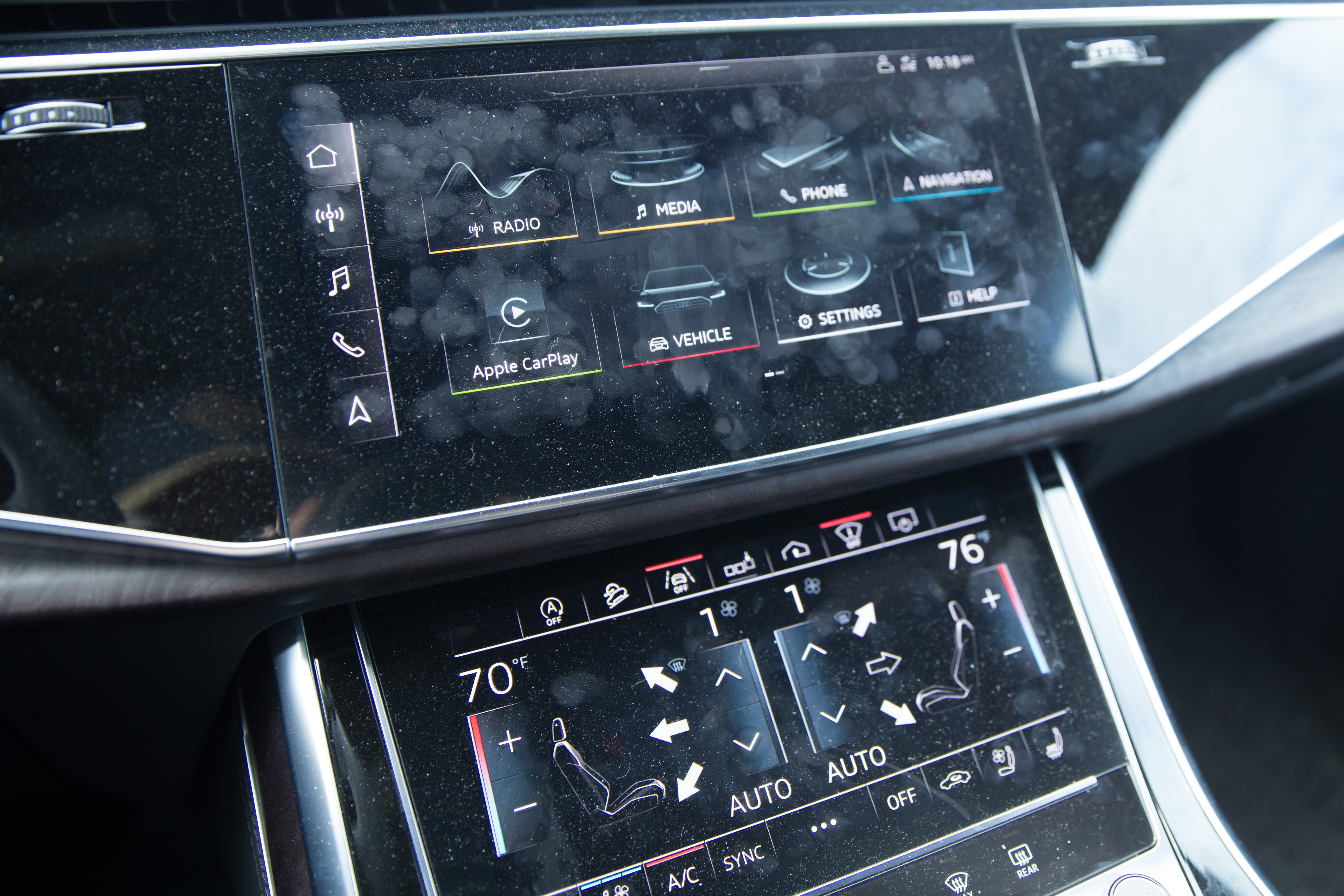 Hay dos pantallas colocadas en la pila central del Q8. La primera cuenta con controles para la radio, el sistema de mapeo y la configuración del vehículo. La pantalla inferior es para controles de clima y controles adicionales como el abrepuerta de garaje y las cámaras del vehículo. Ambos tienen retroalimentación táctil, por lo que los botones se sienten casi reales.