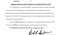 De conformidad con su acuerdo, Patrick Wood Crusius aceptó pagar una restitución por la cantidad de $5,557,005.55 a los familiares de las 23 víctimas.