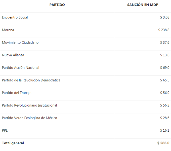El partido más sancionado es Morena, con 238.8 millones de pesos, seguido del PAN con 68 millones y el PRD con 65.5 millones de pesos.
