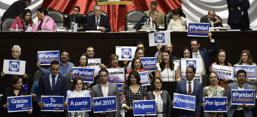 El pleno de la Cámara de Diputados avaló por unanimidad con 445 votos en favor y sin cambios, la minuta del Senado de la República de reformas constitucionales a fin de que la mitad de los cargos públicos en los tres órdenes de gobierno sean ocupados por mujeres.