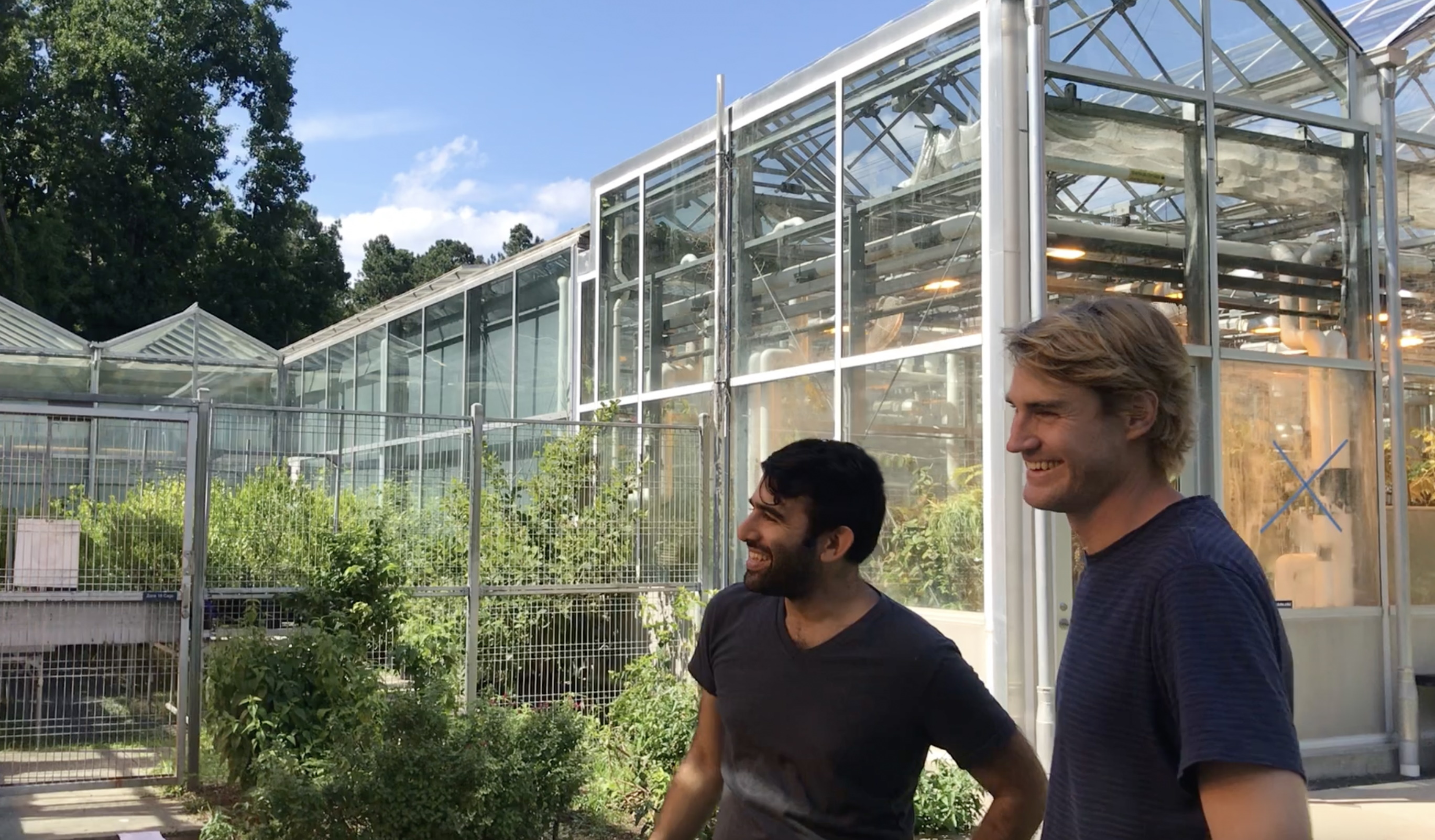 Los cofundadores de Avalo, Mariano Alvarez (izquierda) y Brendan Collins, junto a un invernadero. Créditos de imagen: Avalo