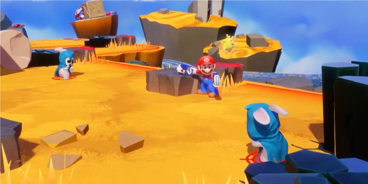 Uno de los mayores cambios en Mario + Rabbids: chispas de esperanza es la jugabilidad, ya que los personajes ahora pueden moverse libremente en un área limitada durante su turno en tiempo real, en lugar de un movimiento limitado por turnos. También hay elementos que permiten a los personajes eludir los peligros, como Edge usando una versión de helicóptero de Beep-O para volar y ponerse detrás de los enemigos. Es posible que un personaje se lance contra sus enemigos mientras se mueve, lo que puede resultar en efectos especiales, como activar Bob-Ombs, lo que les permite ser arrojados como explosivos. Un aspecto del original. Mario + Rabbids: Batalla del Reino Lo que sigue siendo importante es la cobertura, ya que terminar un turno con un personaje en el campo lo dejará completamente abierto a los contadores enemigos. Esta libertad de movimiento le da al jugador mucho más control sobre su escuadrón en la batalla, lo que hace que sea mucho más difícil cometer errores o quedarse en una posición desafortunada.