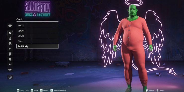Se presta un nivel similar de atención a la cabeza del Jefe. Hay muchas opciones para alterar los rasgos faciales del Jefe, agregar aretes, cicatrices, tatuajes, maquillaje, arrugas y adornos para la cabeza. Estos van desde rasgos humanos reconocibles hasta apéndices alienígenas. Hay muchas posibilidades de crear detalles que los jugadores ni siquiera verán durante la mayor parte del juego normal y solo aparecerán durante las escenas. Hay toneladas de opciones de cabello, tanto para la cabeza como para el cuerpo, lo que es especialmente útil para aquellos que desean recrear un personaje ficticio específico en su juego. Fábrica de jefes de Saints Row tiene muchas opciones de ropa disponibles, aunque el juego completo desbloqueará más a través de sus tiendas. Estos van desde prendas de vestir individuales hasta trajes de cuerpo completo, como un mini vestido o calzoncillos largos. También es posible cambiar el color de cada prenda de vestir para personalizar aún más el aspecto del Jefe. Fábrica de jefes de Saints Ross no permite que Boss tenga un traje de alas todavía, ya que es probable que se desbloquee en el transcurso del juego, pero todavía hay muchas opciones de ropa disponibles.