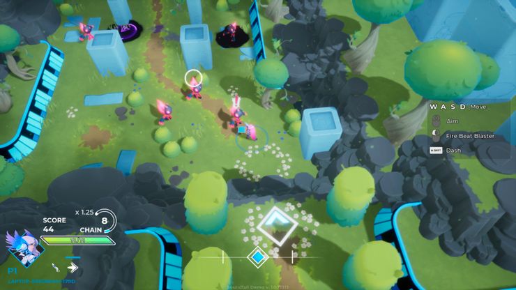 El primer mundo de caída de sonido se divide en diferentes etapas, cada una de las cuales contiene una sola canción como pista de fondo, con un ritmo que determina el compás. Esto significa que las canciones más rápidas le dan al jugador más posibilidades de usar disparos potentes y rápidos, pero se vuelve más difícil seguir el ritmo. Los enemigos en el caída de sonido La demostración tiene una combinación de habilidades, como pequeños enemigos que intentan rodear a Melody, francotiradores de largo alcance que se lanzan por el campo, dinosaurios que disparan misiles como parte de un ataque AoE y enemigos voluminosos que realizan ataques de salto. Los encuentros de combate iniciales son muy sencillos, pero se vuelven extremadamente complicados cuando aparecen diversos grupos de enemigos. Las batallas son rápidas y el jugador debe estar alerta en todo momento, ya que el tablero no perdona y solo otorga un breve momento de seguridad contra los ataques. El combate es muy divertido, incluso si mantener el ritmo puede ser difícil en el fragor de la batalla, especialmente al hacer malabarismos con diferentes botones.
