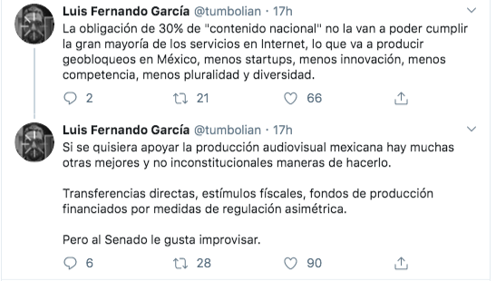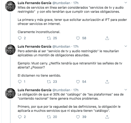 Luis Fernando García, director de la organización Red en defensa de los derechos digitales (R3D), también se pronunció contra la misma por los siguientes motivos que explicó en un hilo en Twitter: